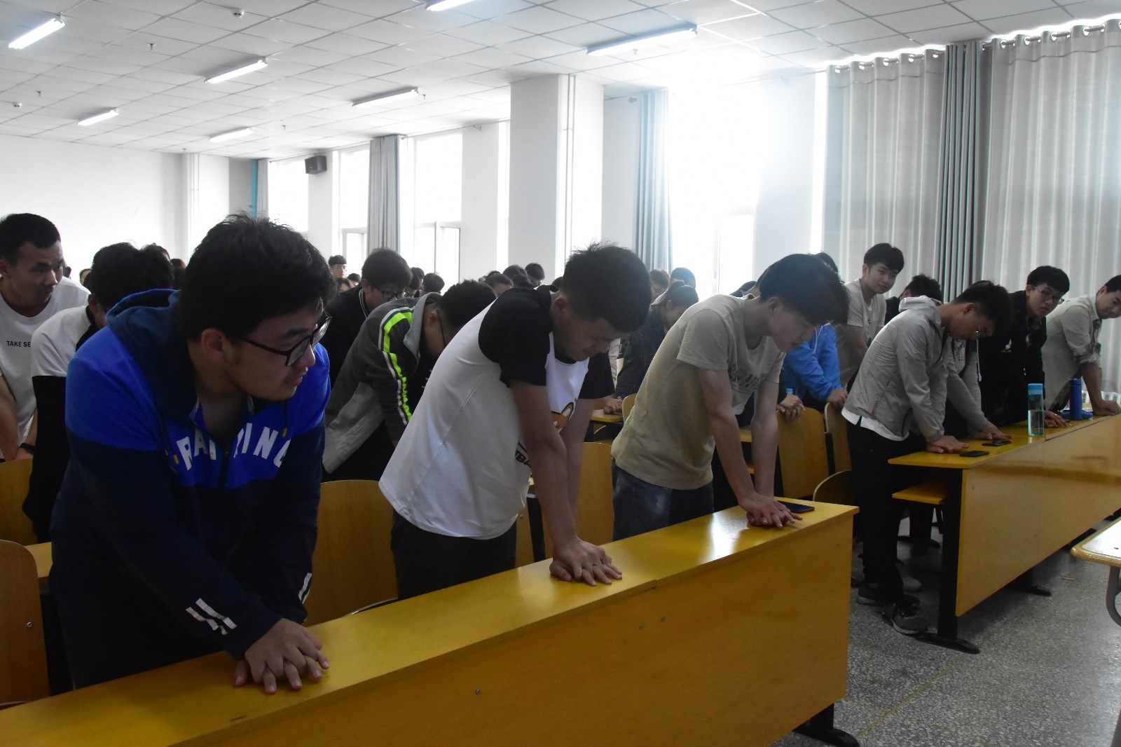 张老师用人体模型给同学们演示心肺复苏、人工呼吸救护规范性操作,详细示范讲解遇到踩踏事件时如何自我保护。同学们现场模拟演示了胸外按压以及人工呼吸的具体操作技术和踩踏时的自救方法。