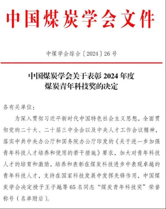据悉,煤炭青年科技奖经科技部国家科学技术奖励工作办公室批准设立,旨在造就一批进入国内外科技前沿的青年学术和技术带头人,在煤炭工业发展和科技创新中做出突出成就的青年科技人才。我校青年教师摘取该奖项,不仅是中国煤炭学会对我校青年教师个人科研贡献的认可,也是对我校青年科研团队建设和科技创新实力的充分肯定,将进一步激发我校青年科技工作者锚定科技前沿、致力科技创新,为学校高质量发展提供更好人才保障和科研支撑。