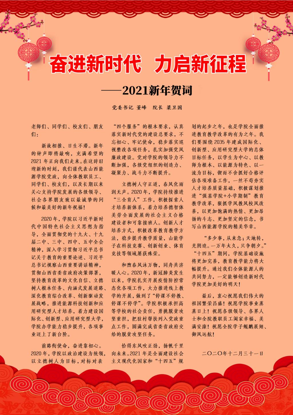 新故相推,日生不滞。新年的钟声即将敲响,充满希望的2021年正向我们走来。在这辞旧迎新的时刻,我们谨代表红宝石9999hbs在线登录党政,向全体教职员工、同学们、校友们,以及长期以来关心支持学院发展的各级领导、社会各界朋友致以最诚挚的问候和最美好的新年祝福!