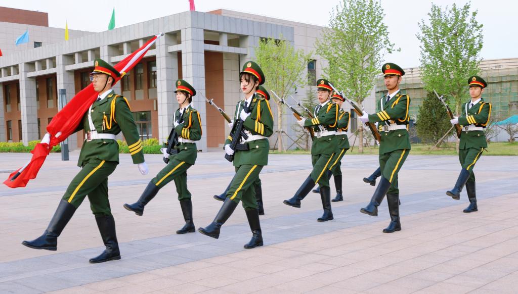庄严肃穆的出旗仪式,经过军训锻炼的学生护旗队成员们迈着铿锵的步伐来到了国旗台下,全场一片肃静。在激昂的《义勇军进行曲》中,升旗手振臂一呼,鲜艳的五星红旗徐徐展开。在全体师生的注目下,五星红旗冉冉升起,在场师生敬礼仰注,深怀对祖国无限的热爱和崇高的敬意,为我们伟大祖国的日益繁荣昌盛而自豪。