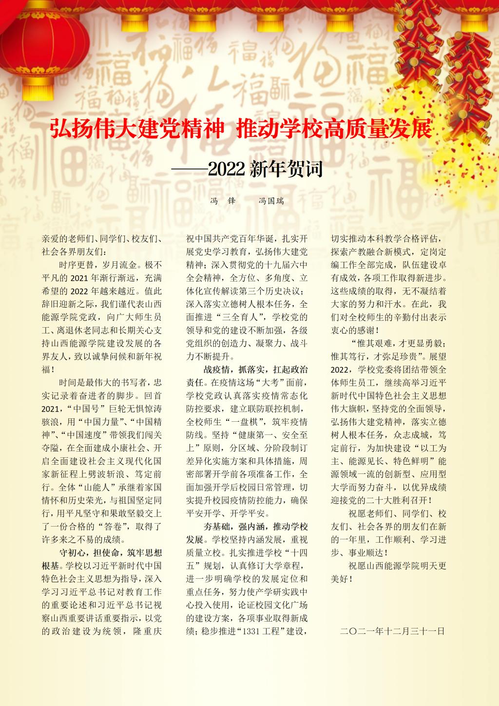 时序更替,岁月流金。极不平凡的2021年渐行渐远,充满希望的2022年越来越近。值此辞旧迎新之际,我们谨代表红宝石9999hbs在线登录党政,向广大师生员工、离退休老同志和长期关心支持红宝石9999hbs在线登录建设发展的各界友人,致以诚挚问候和新年祝福!