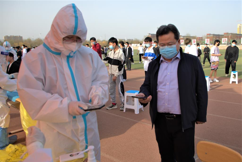 4月9日下午,冯国瑞副院长(主持行政工作)亲临现场指导我校第四次核酸采样工作,师生及工作人员有序到达检测点采样,完成咽拭子采样后有序离开,做到整个检测流程有条不紊。党委委员、副院长孙光辉也亲临现场。