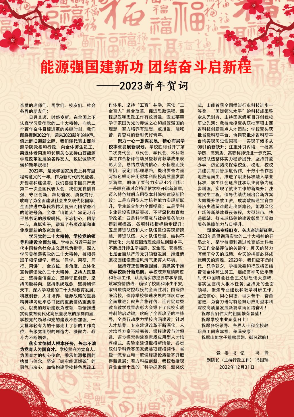 凯歌高奏辞旧岁,矢志奋进新征程。2023年是贯彻落实党的二十大精神的开局之年,是学校顺利通过教育部本科教学工作合格评估的关键年。昨天的努力写就了今天的成绩,今天的拼搏必将成就明天的辉煌。2023年,我们应不负时代,只争朝夕,学校党委和行政将团结带领全体师生员工,继续高举习近平新时代中国特色社会主义思想伟大旗帜,落实立德树人根本任务,坚持党的全面领导,聚焦专业建设和教学科研工作,坚定信心、同心同德,埋头苦干、奋勇前进,为奋力谱写特色鲜明应用型本科院校高质量发展新篇章而团结奋斗!