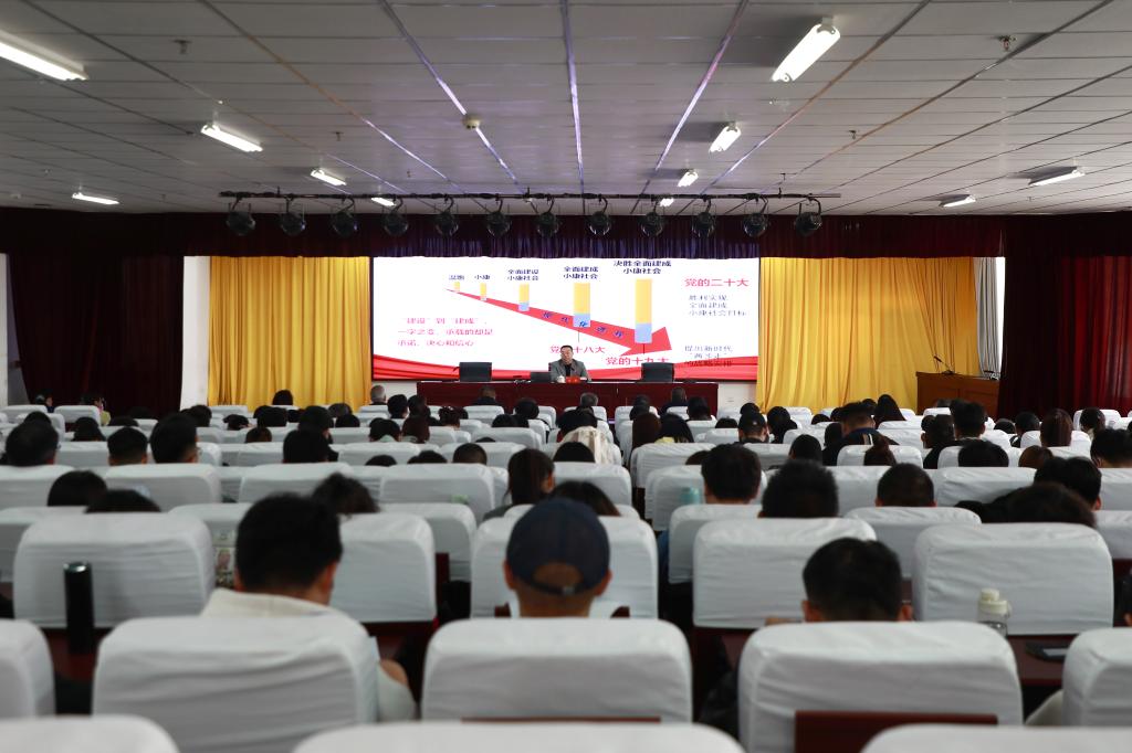 为深入学习宣传贯彻党的二十大精神,2023年3月28日下午,党委书记冯锋在综合楼二层报告厅以《推进强国建设 矢志民族复兴 在新征程上作出我们这一代人的应有贡献》为题为师生讲授开学第一课暨思政课首讲。各党总支书记、直属党支部书记、各部门负责人以及思政教师、学生代表近200人聆听了这堂课。党委副书记桑楠主持“开学第一课”。