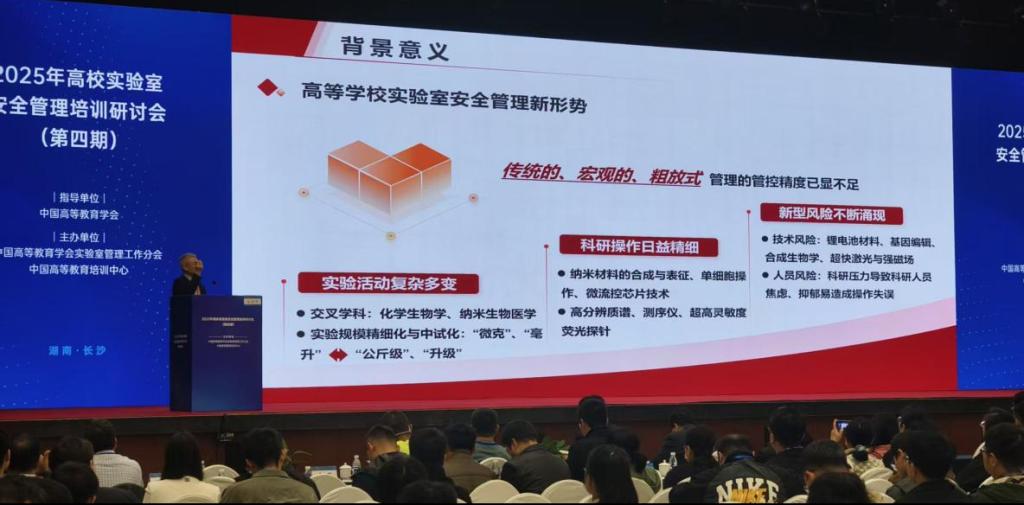 10月24日至27日,由教育部高等学校实验室建设与实验教学指导委员会主办的“2025年高校实验室安全管理培训研讨会(第四期)”在湖南长沙召开。本次会议汇聚了来自全国高校的近千名实验室管理工作者,围绕实验室安全管理的政策规范、风险防控与能力建设等议题展开深入交流。我校由实验实训中心综合管理办公室主任郝雷、能源化学与材料工程系副主任李永峰带队,教师李飞宇、武江红等人员参会。