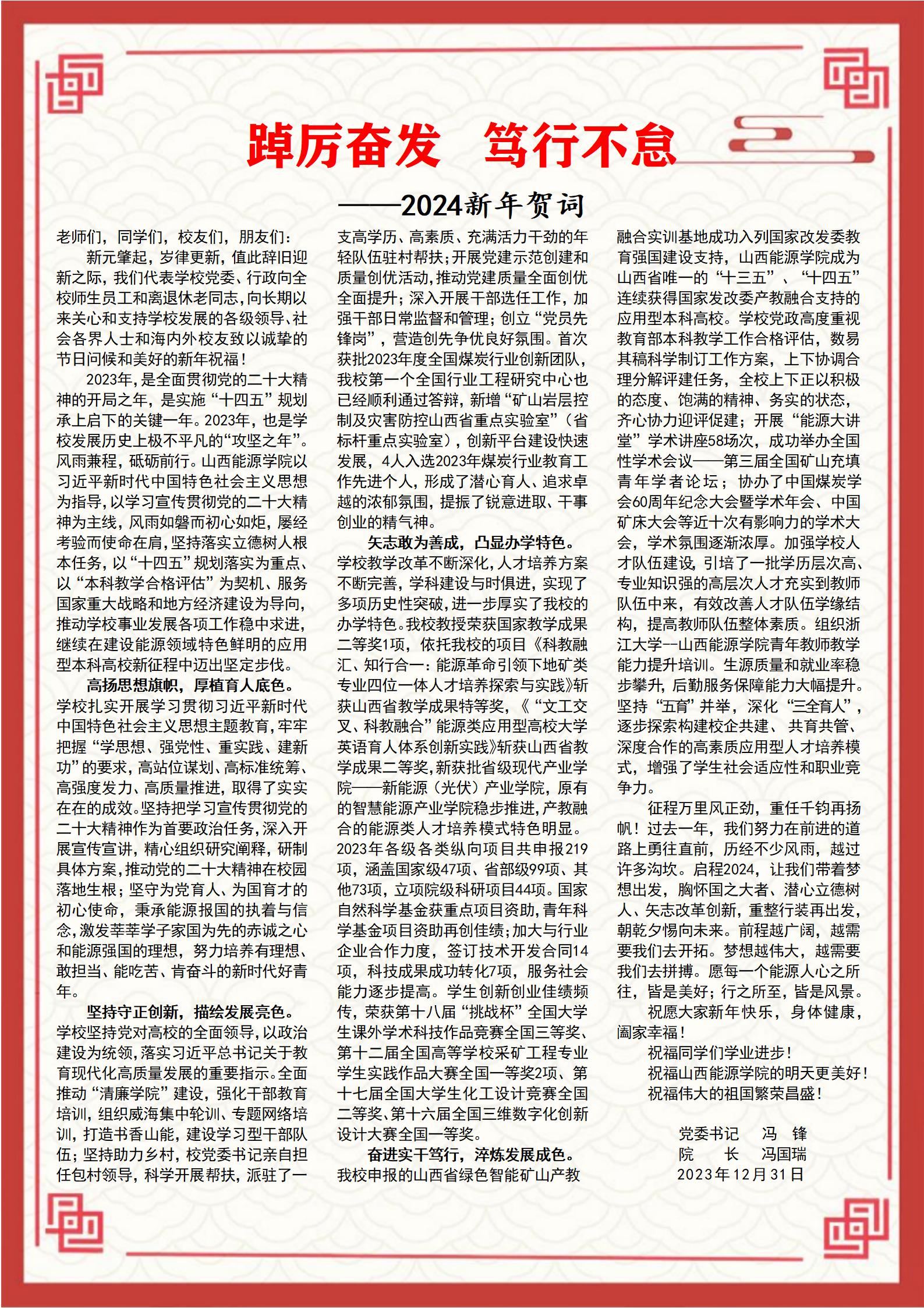 征程万里风正劲,重任千钧再扬帆!过去一年,我们努力在前进的道路上勇往直前,历经不少风雨,越过许多沟坎。启程2024,让我们带着梦想出发,胸怀国之大者、潜心立德树人、矢志改革创新,重整行装再出发,朝乾夕惕向未来。前程越广阔,越需要我们去开拓。梦想越伟大,越需要我们去拼搏。愿每一个能源人心之所往,皆是美好;行之所至,皆是风景。